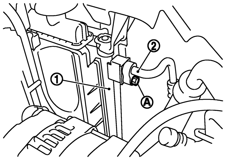 2.取付ボルト(A)を外し、高圧フレキシブルホース(2)とコンデンサー(1)との接続を外す。
