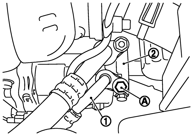3.取付ボルト(A)を外し、高圧フレキシブルホース(1)とコンプレッサー(2)との接続を外す。