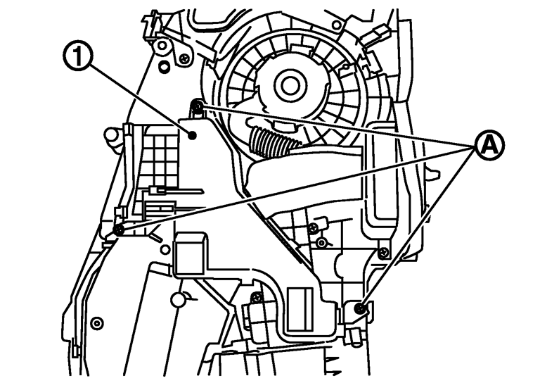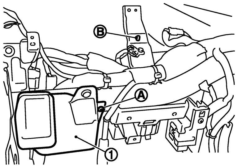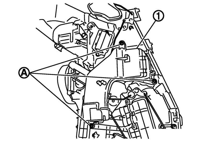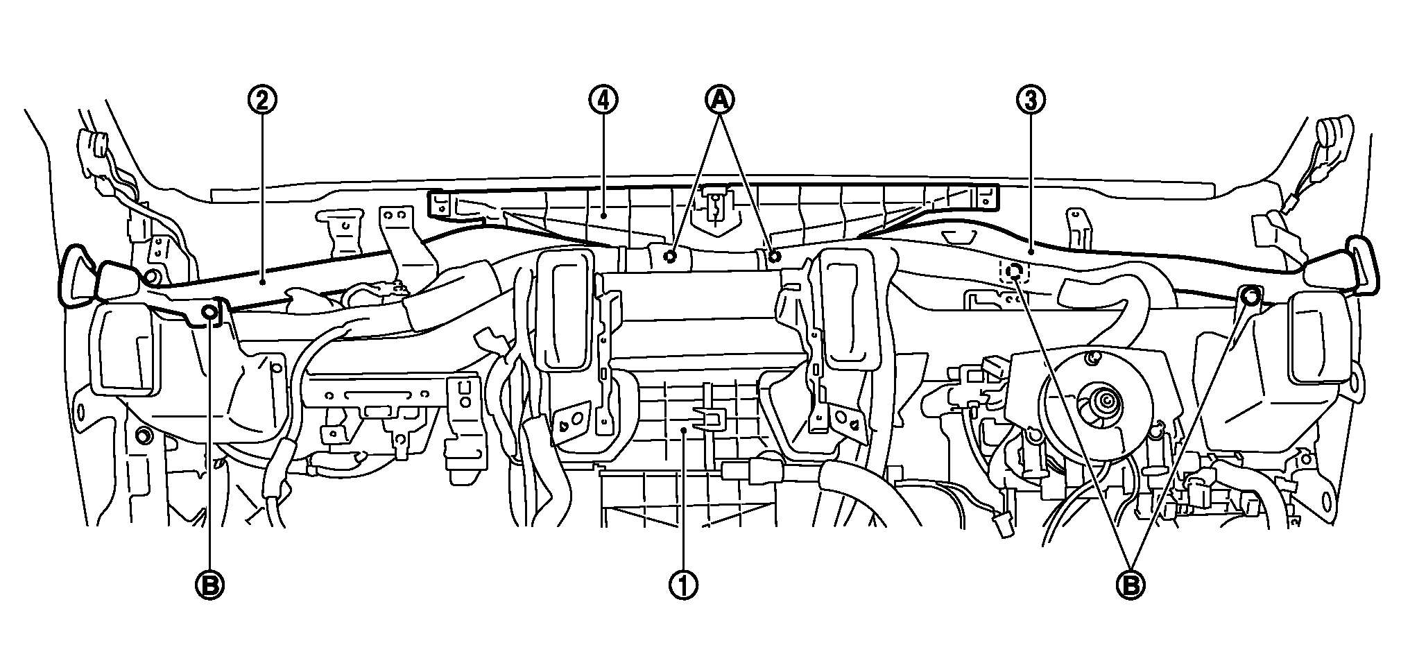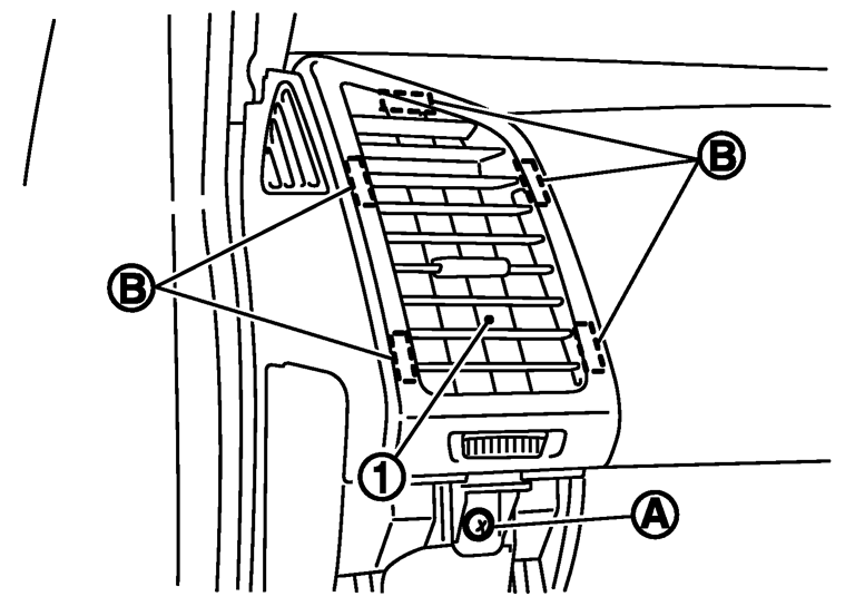 - 4.ステアリングメンバー取付ボルトを外し、手前にずらした状態で、取付スクリュー(A)及びクリップ(B)を外し、サイドベンチレーターダクト(右)(1)を取り外す。エアコンユニットを参照。