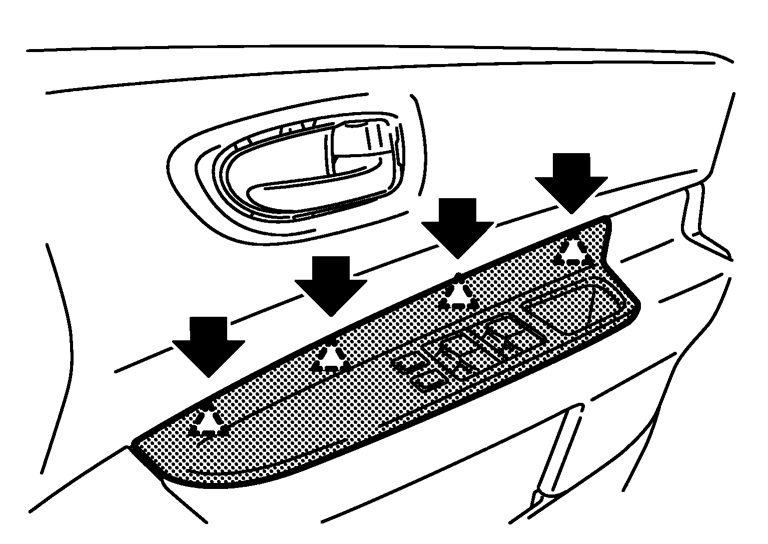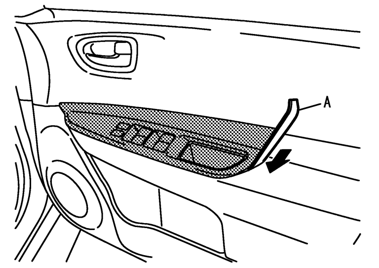 3.パワーウインドースイッチフィニッシャーとドアフィニッシャーの間(右イラスト矢印部)にリムーバーツールを差し込み、リムーバーツールを室外側へ押し込み、樹脂爪のかん合を外す。