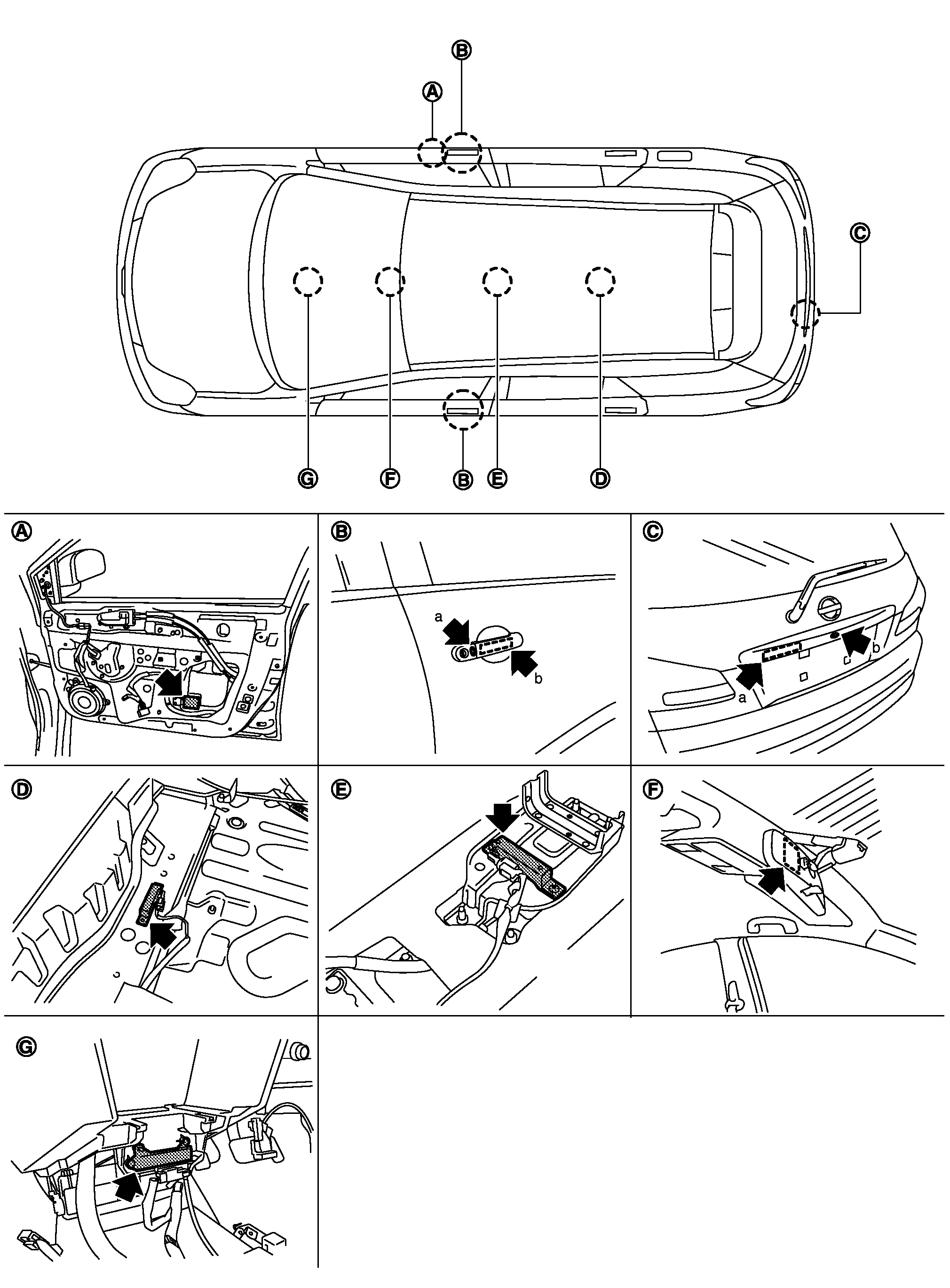 a:ドアリクエストSW(運転席/助手席) b:室外アンテナ(運転席/助手席) |