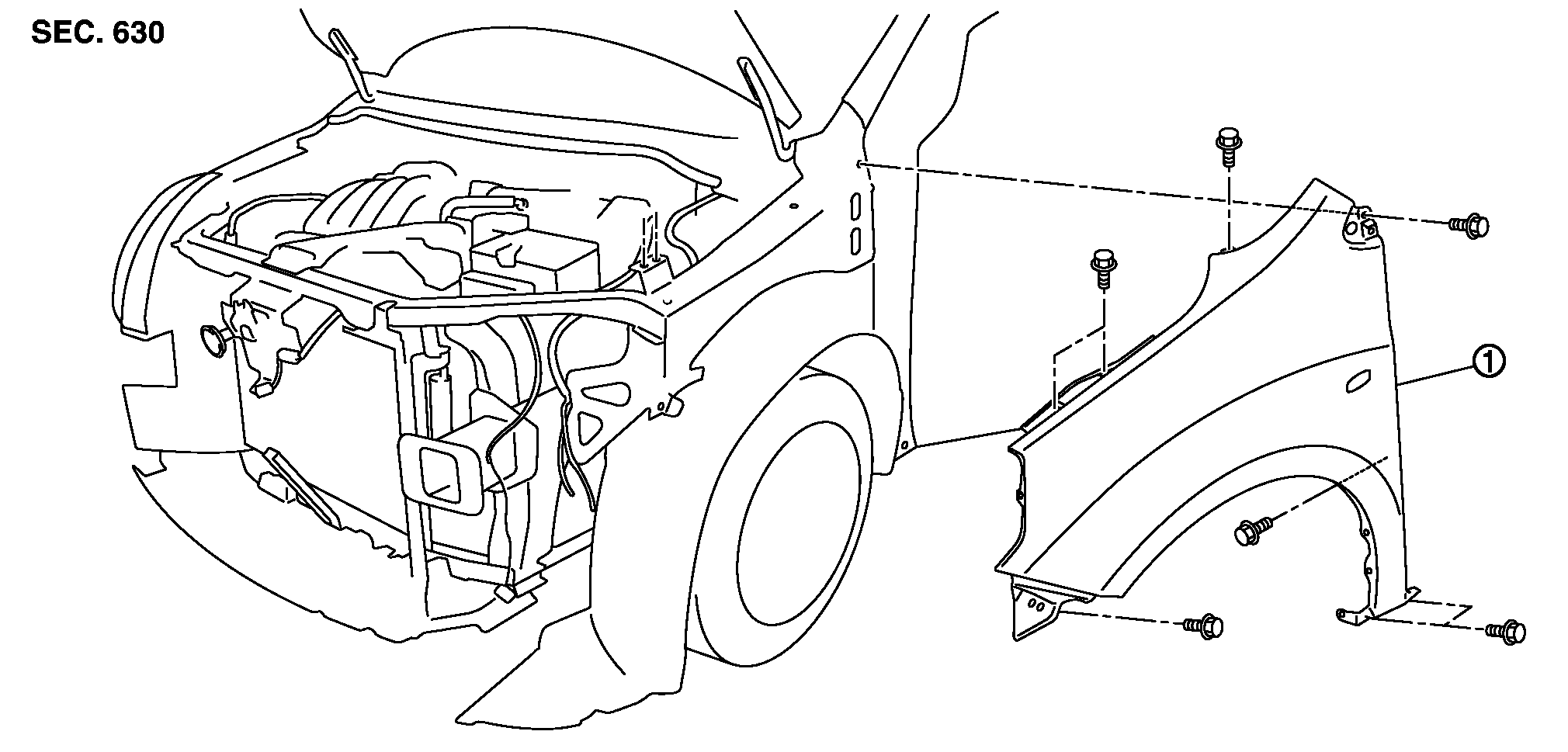 - 取り外しの際、フェンダ−取付ボルトの塗装が剥がれた場合は、車体色と同じ色のタッチアップペイント等を用いて塗布すること。
