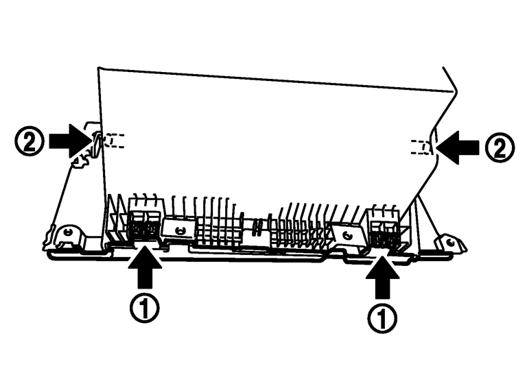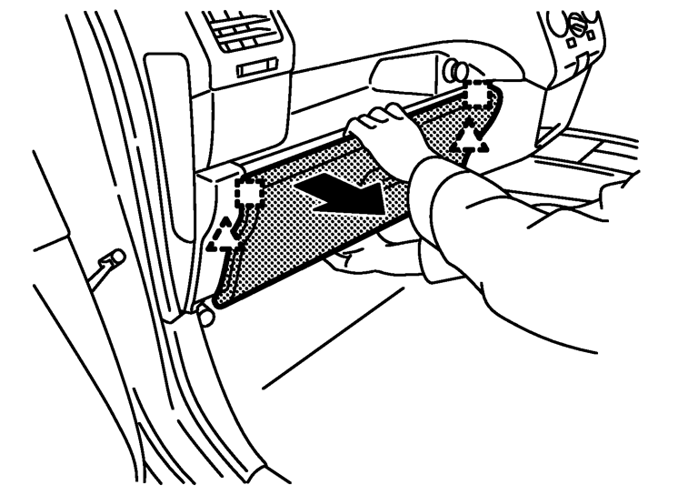 4.グローブボックス横側のガイド(2)を片側ずつ外し取り外す。
