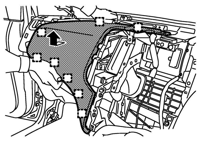 - インストルメントアッパーパネルASSYを持ち上げ、樹脂爪及びメタルクリップのかん合を外す。