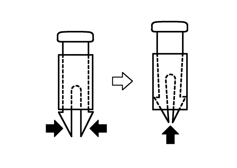 - リフターレバーキャップ(リフター付きのみ)の中央下部切り欠きよりマイナスドライバー等で、リフターレバーキャップを取り外す。■ 注意 ■マイナスドライバーはテープ等を巻いて、干渉キズを防止すること。