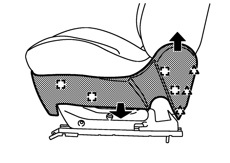 - シートクッションインナーフィニッシャーの後方より樹脂爪、メタルクリップを外す。■ 注意 ■脱着時、シートベルトバックル取付部により、干渉キズの恐れがあるため、保護テープなどを貼り付けて作業すること。