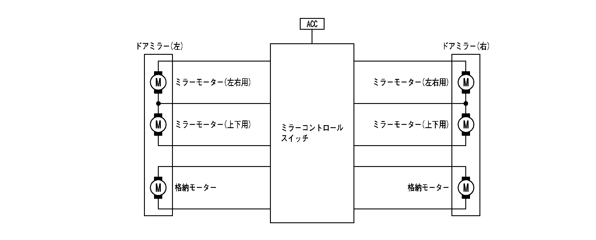 ステアリングコラム右側にあるミラーコントロールスイッチを操作することによりドアミラー鏡面の調整及びドアミラーの格納が出来る。