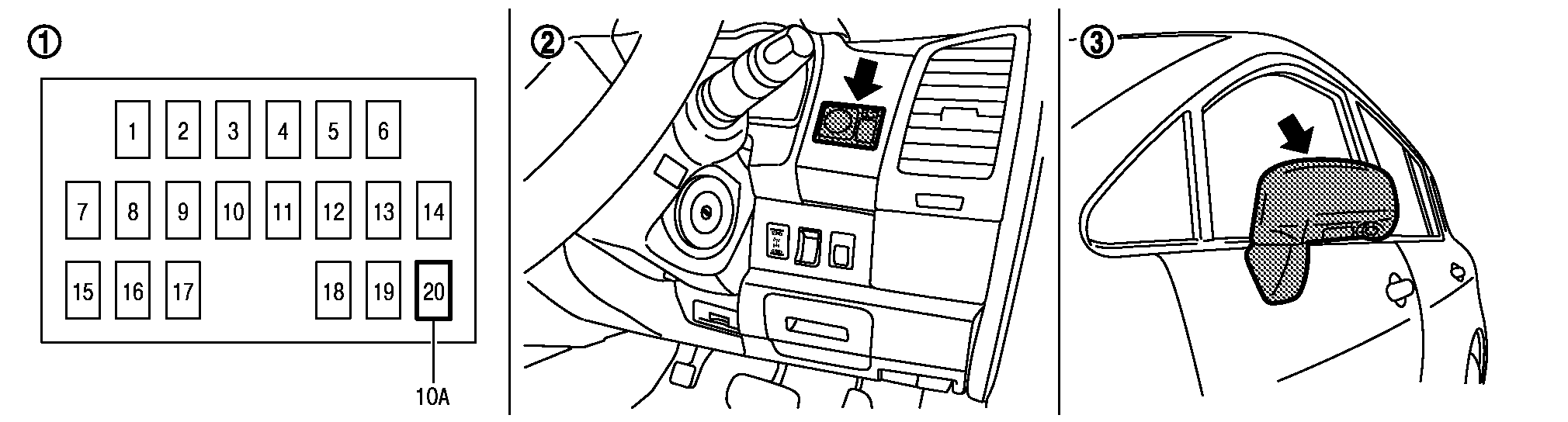 ミラースイッチ、左右切換スイッチ及び格納スイッチを操作することで、ミラーモーター又は格納モーターに電源を供給する。