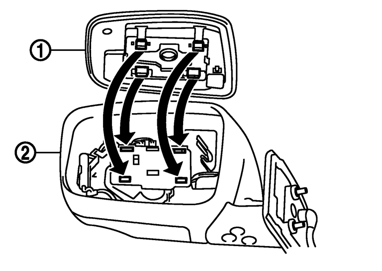 - 9.ミラーボディー(1)の下側の爪をドライヤー等で温めた後、上側の爪を先にパワーユニット(2)に取り付け、その後鏡面の下側をパチンと音が鳴るまで押し、下側の爪をかん合させる。