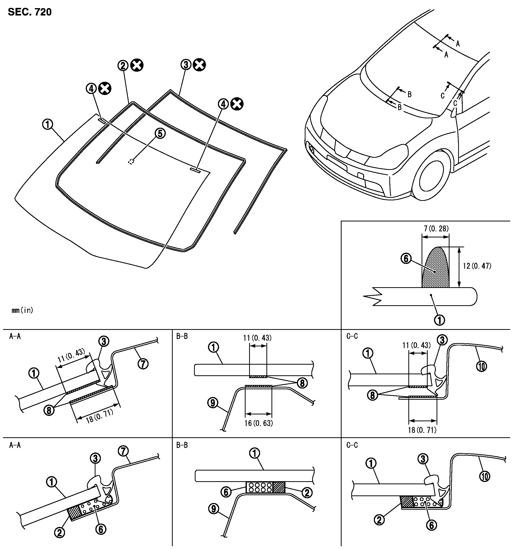 - ウインドシールドモールの取り付けは接着剤が硬化する前に必ず行うこと。