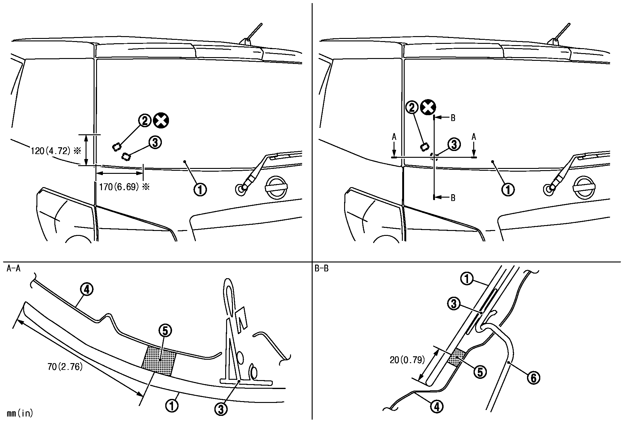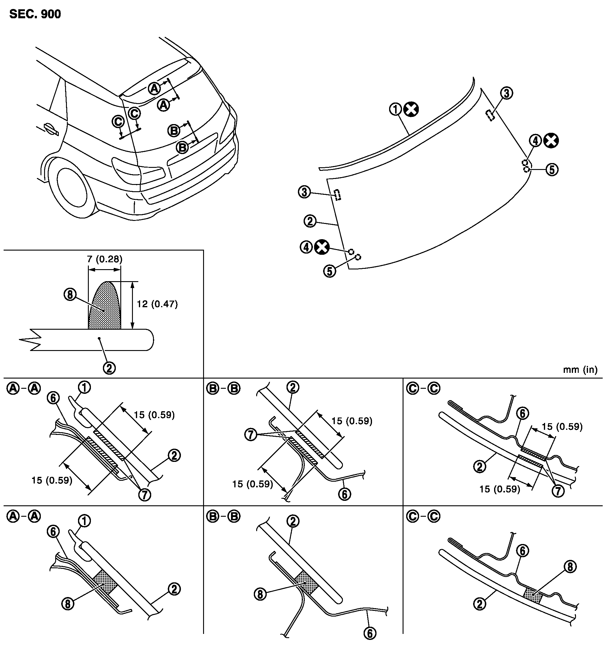 | 4. | バックドアアウターパネル | 5. | 接着剤 | 6. | デフォッガーハーネス |