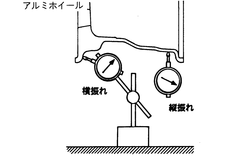 - 2.ロードホイールを車両に取り付け、図のようにダイヤルゲージをセットしホイールの振れを点検する。