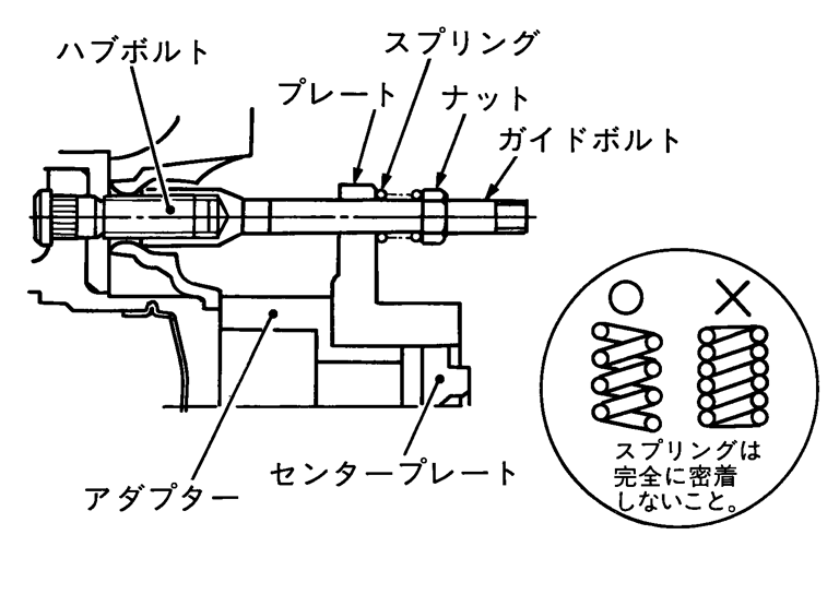 - 4.ガイドボルトにプレートを差し込み、スプリングを取り付け、ガイドボルトのナットを均等にねじ込む。