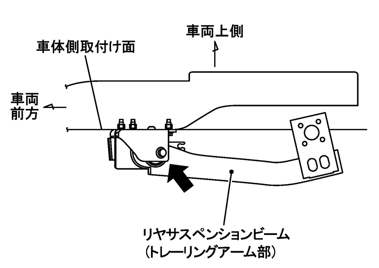 取外後の点検リヤサスペンションビーム及びブッシュに変形、き裂、損傷等がないか点検し、異常がある場合は交換する。
