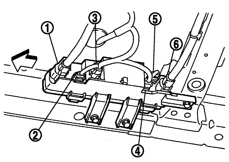 1.ジャンクションボックスよりe·4WDモーターコネクター(1)、ヒューズBコネクター(2)、電流センサーコネクター(3)、メインリレーコネクター(4)、ヒューズAコネクター(5)、及びパワーケーブルコネクター(6)を外す。