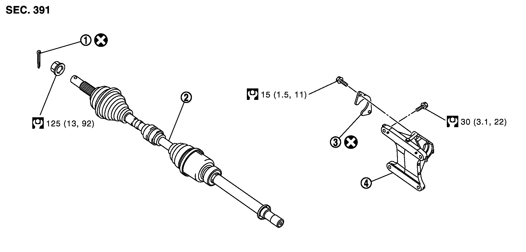 ドライブシャフトのジョイント部に過大な角度を与えないこと。また、スライドジョイントを過大に伸ばさないこと。- 5.プレート取り付けボルトを外し、ドライブシャフトをトランスアクスルASSYより取り外す。