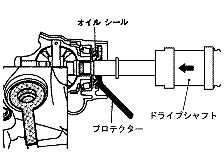 - ドライブシャフト挿入時、トランスアクスルのサイドオイルシール損傷防止のため、オイルシール部にプロテクター(特殊工具:KV38106700)を取り付けてから挿入し、ドライブシャフトのスライドジョイントをスライドさせ、ハンマーリングの要領で確実に取り付ける。■ 注意 ■CVT車は、ドライブシャフトを取り付ける際、トランスアクスルのサイドオイルシールを新品にすること。取り外し、取り付けを参照する。