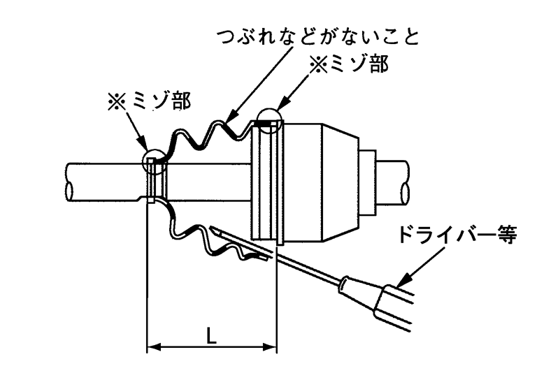 - ブーツを図の溝部(※部)へ確実に取り付ける。■ 注意 ■シャフト及びハウジングのブーツ取付溝(※部)にグリースが付着しているとブーツが外れるおそれがあるので、付着したグリースは除去すること。