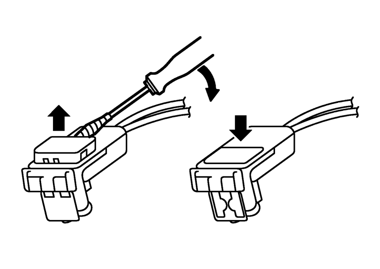 - カーテンエアバッグ用コネクタの脱着は、テープを巻いたマイナスドライバを切り欠き部に差し込み、ロックを引き上げてコネクタを外す。