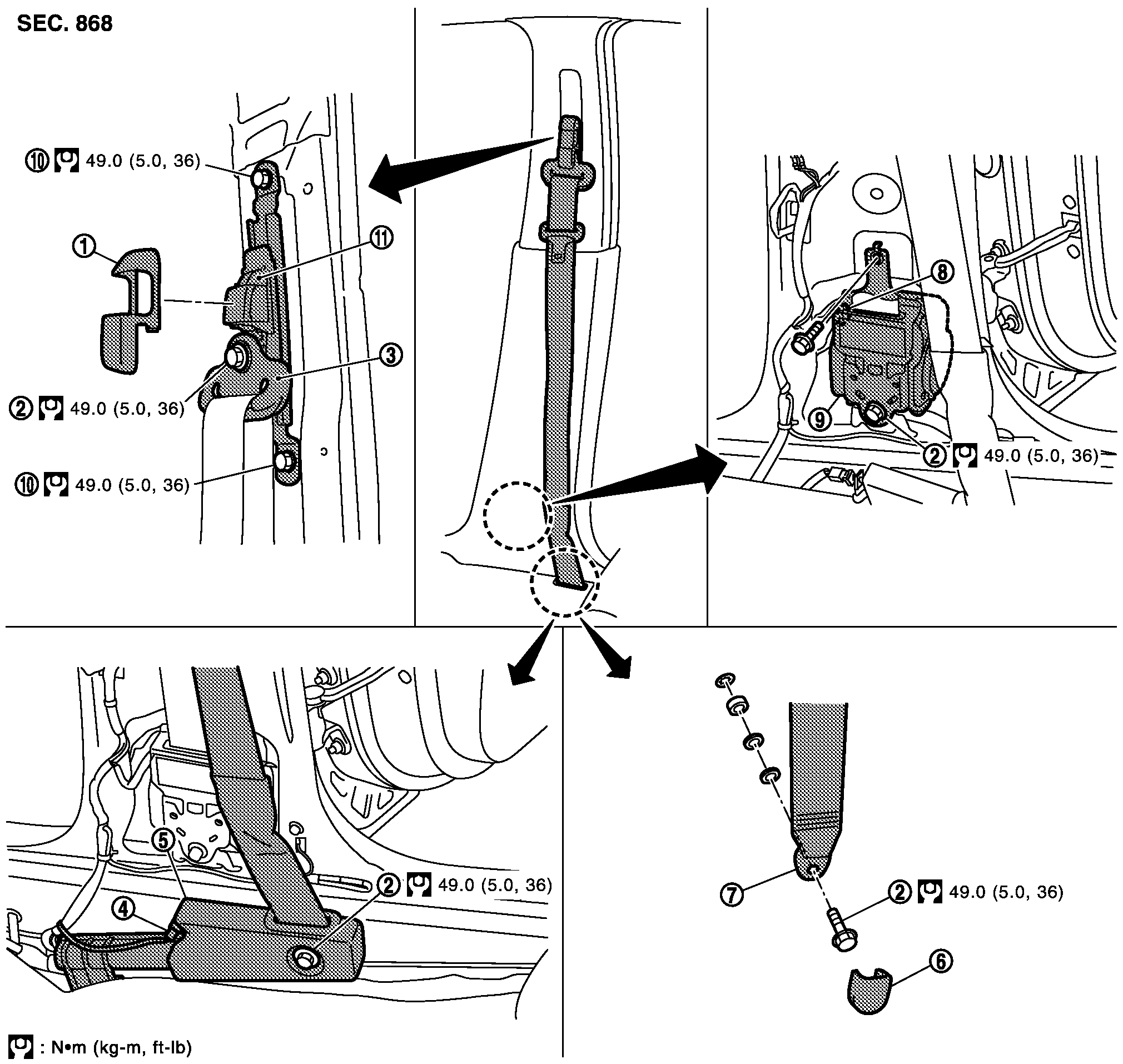 2.センターピラーロアガーニッシュとセンターピラーアッパーガーニッシュを取り外す。「EI 外装・内装」のボディーサイドトリムを参照。
