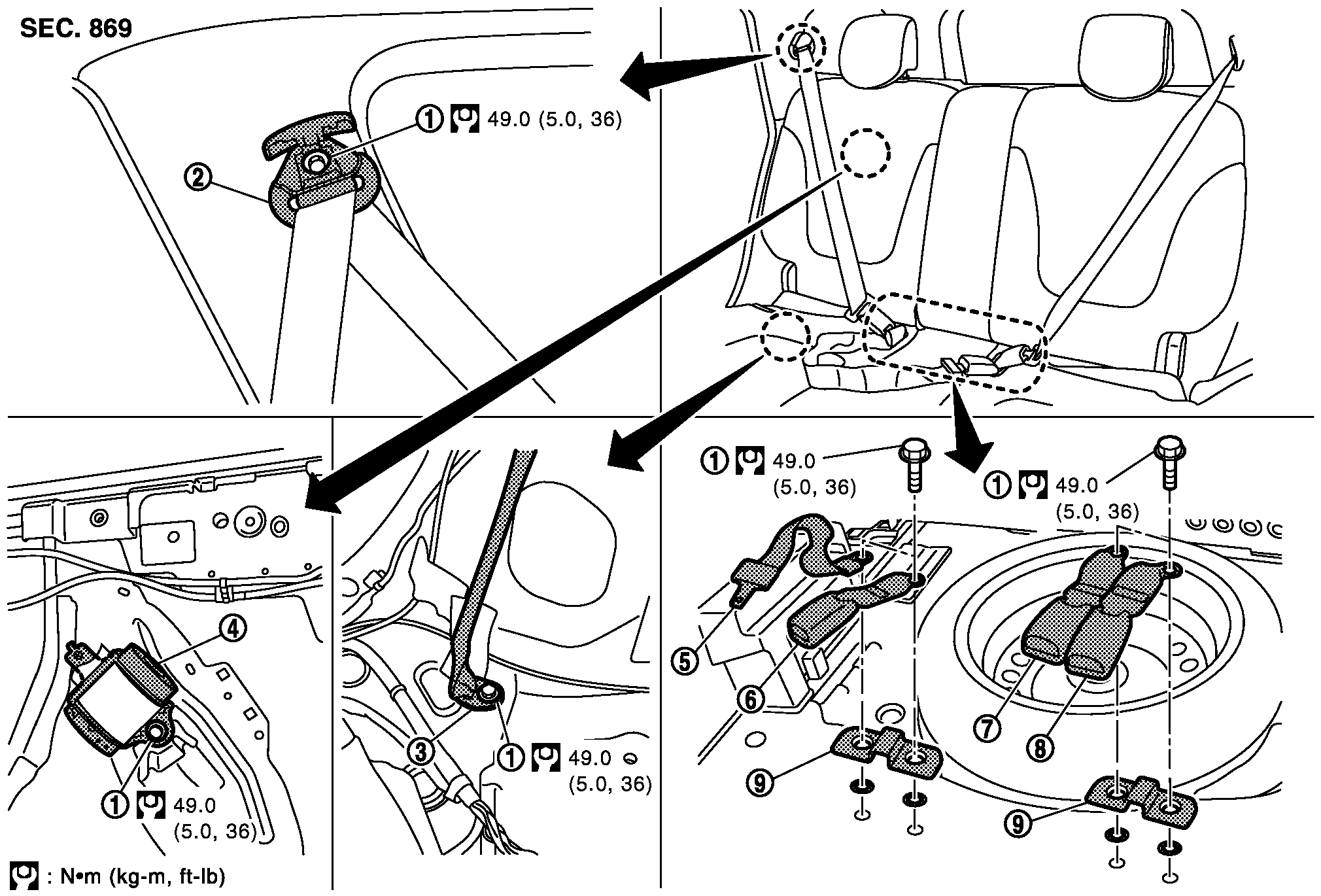 - アウター、センターシートベルトバックルとセンターシートベルトタングの取付アンカーボルトを取り外す。