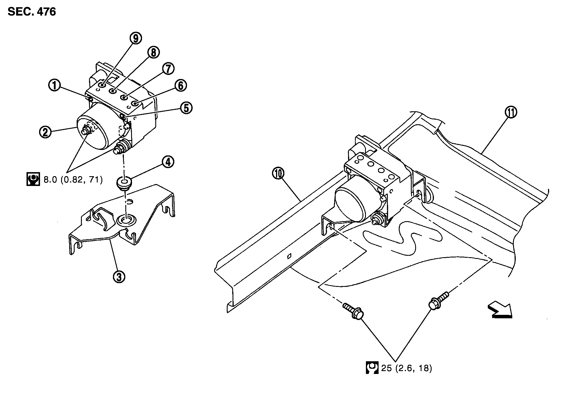 ブレーキチューブの取り外しは、フレアナットレンチを用いて行い、フレアナット及びブレーキチューブに傷を付けないよう作業すること。- 5.ABSアクチュエーター・C/U取付ボルトを取り外し、ABSアクチュエーター・C/Uを取り外す。
