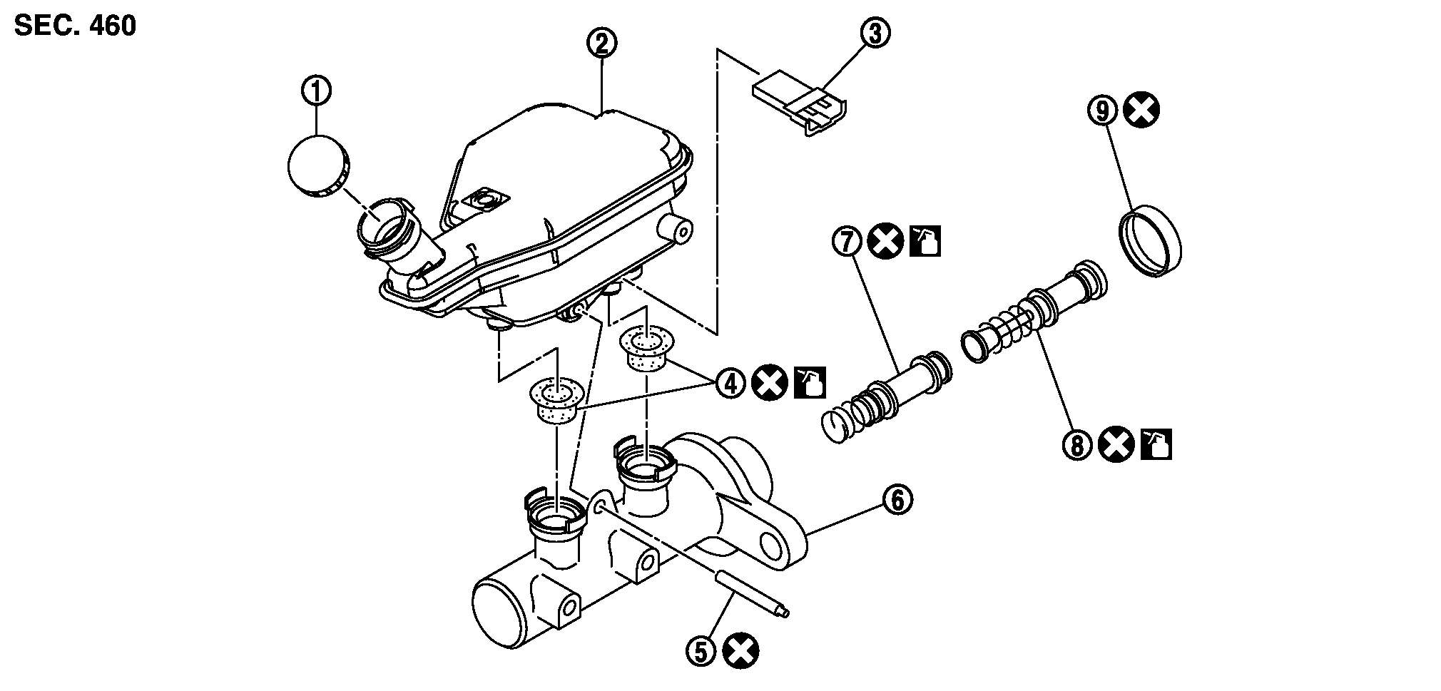 ストッパーキャップは再使用不可部品のため、再使用しないこと。- 3.グロメットにニッサンブレーキフルードNo. 2500を塗布し、シリンダーボディーに取り付ける。