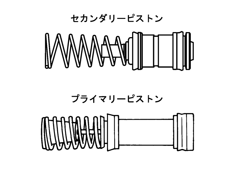 - 1.シリンダーボディー内面及びピストンASSYの接触面にニッサンブレーキフルードNo. 2500を塗布し、シリンダーボディーにセカンダリーピストンASSY、プライマリーピストンASSYを順に挿入する。