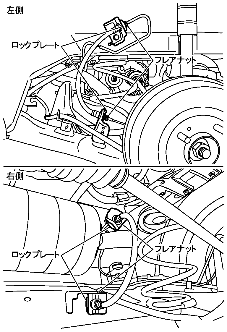 取り付け- 1.ブレ-キチュ-ブにブレ-キホ-スを取り付け、フレアナットを手で回るところまで仮締めし、ブラケットにブレ-キホ-スをロックプレートで固定する。