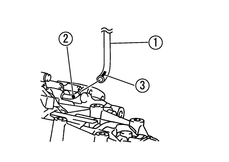 エアブリーザーホース(1)をエアブリーザーチューブ(2)に取り付ける際は、ペイントマーク(3)が車両上側に向く様に取り付ける。また、エアブリーザーホース挿入代は17 mm以上確保する。
