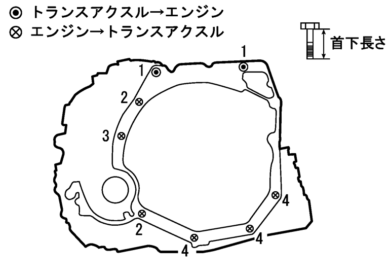 Oリング、銅ワッシャー及びワッシャーは再使用不可部品のため、再使用しないこと。 - トランスアクスルASSYをエンジンASSYに取り付ける際は、取付ボルトを下記の基準で取り付ける。