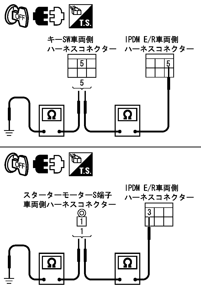 - キースイッチハーネスコネクター5番端子〜IPDM E/Rハーネスコネクター5番端子、スターターモーターS端子〜IPDM E/Rハーネスコネクター3番端子、キースイッチハーネスコネクター5番端子〜ボディーアース及びスターターモーターS端子〜ボディーアース間の導通を点検する。CVT車(MR18DE)を参照する。