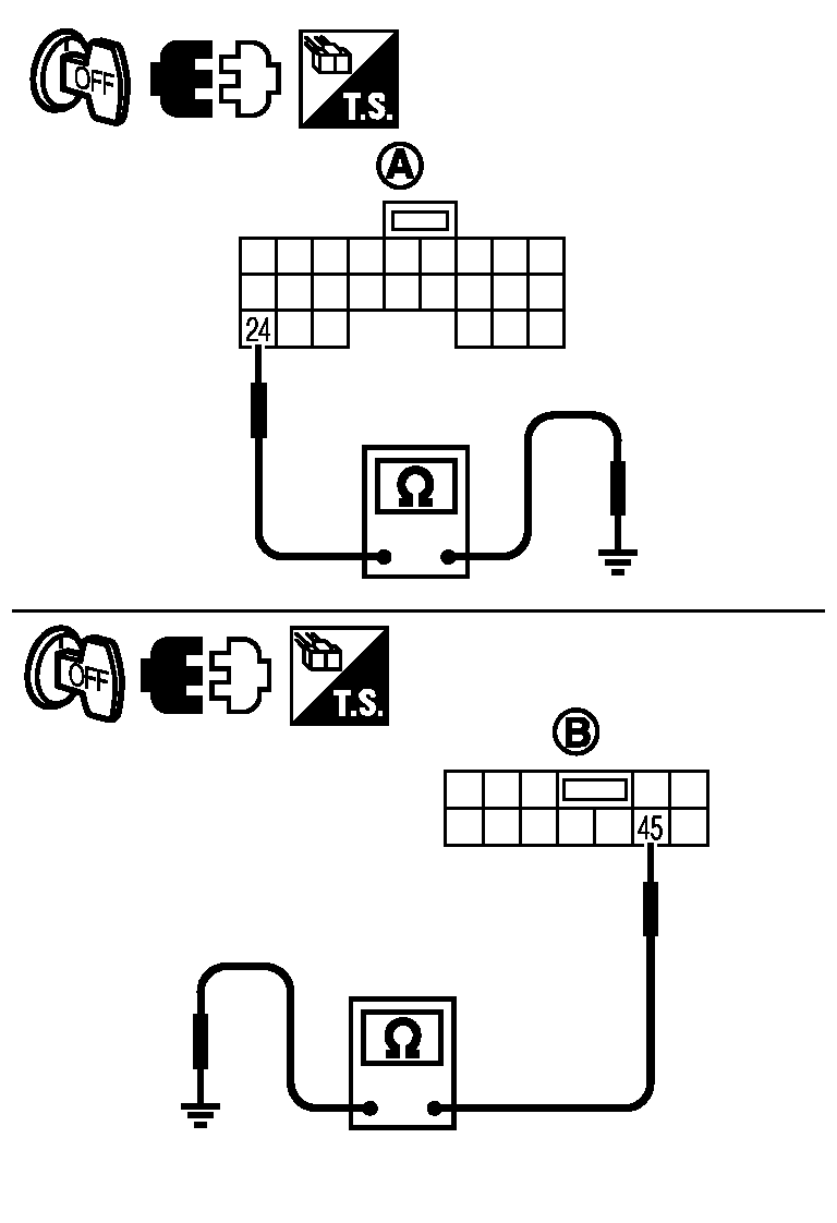 - CVT C/Uハーネスコネクター(A)24番端子及びIPDM E/Rハーネスコネクター(B)45番端子〜ボディーアース間の導通を点検する。