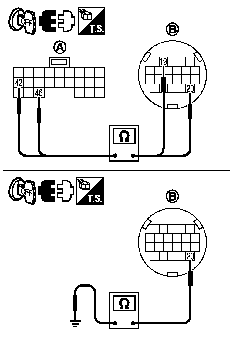 - CVT C/Uハーネスコネクター(A)46番端子〜CVTユニットハーネスコネクター(B)20番端子間、及びCVT C/Uハーネスコネクター(A)42番端子〜CVTユニットハーネスコネクター(B)19番端子間の導通を点検する。また、CVTユニットハーネスコネクター20(B)番端子がボディーアースとショートしていないか点検する。