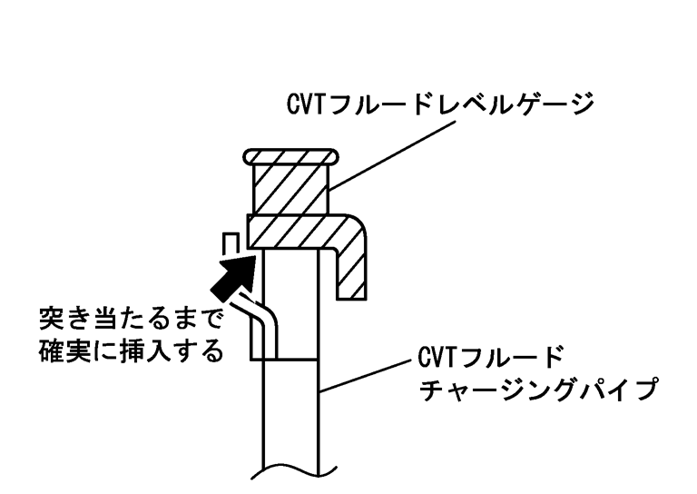 - 点検終了後、CVTフルードレベルゲージを元の状態に戻す際は、CVTフルードチャージングパイプにCVTフルードレベルゲージがロックされるまで確実に挿入すること。