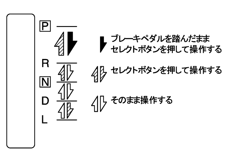 エンジンは始動させないこと。- 2.ブレーキペダルを踏んだまま、セレクトボタンを押してPレンジ以外にセレクトできることを点検する。また、ブレーキペダルを踏まないとPレンジから他のレンジへセレクトできないことを点検する。