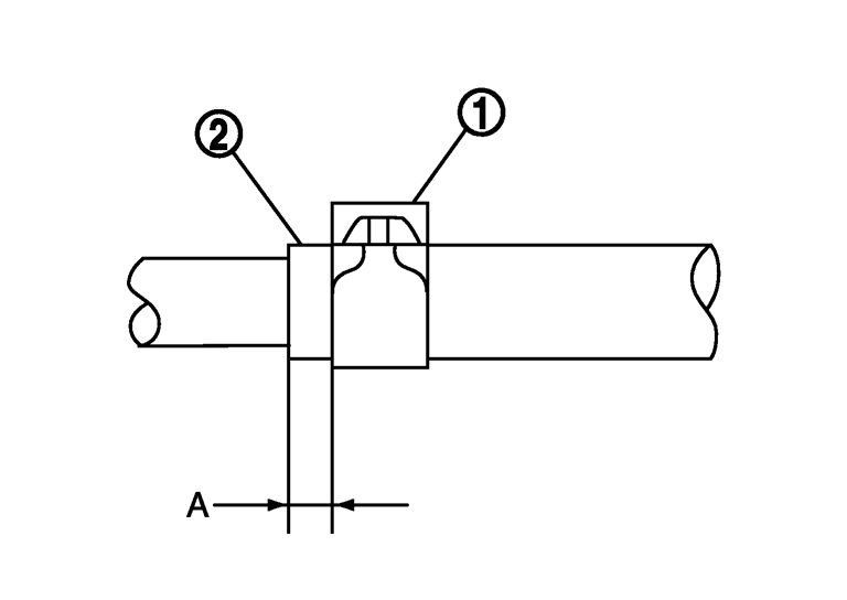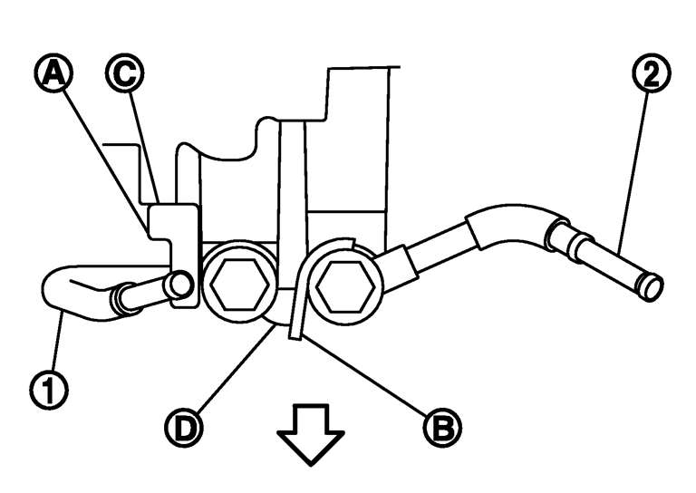 - CVTフルードクーラーチューブ(1)、(2)をトランスアクスルASSY に組み付ける際は、CVT フルードクーラーチューブのまわり止め(A)、(B)をトランスアクスルケース(C)、(D)に当てて組み付ける。