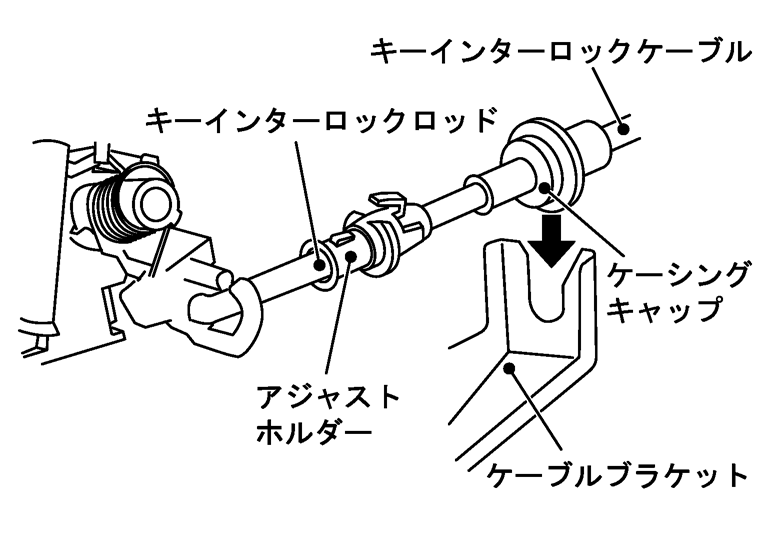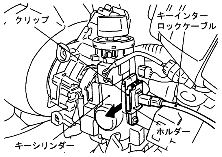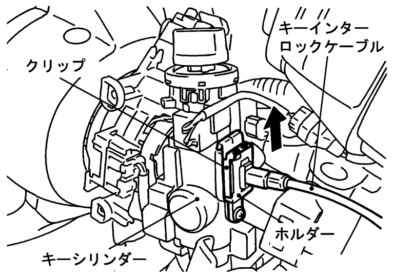 - 2.キースイッチをACC又はONの位置にし、キーシリンダーにキーインターロックケーブルのホルダーを確実に取り付ける。