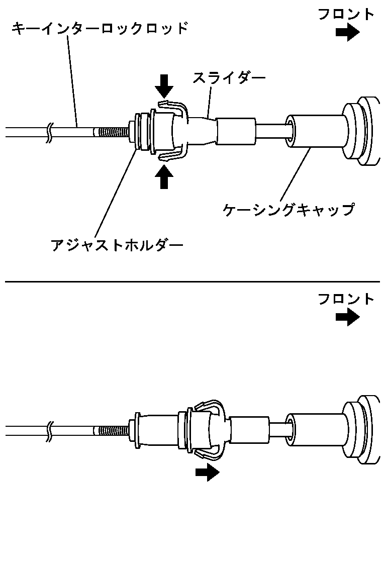 - 7.ケーシングキャップをコントロールデバイスのケーブルブラケットより取り外し、キーインターロックケーブルをキーインターロックロッドから取り外す。