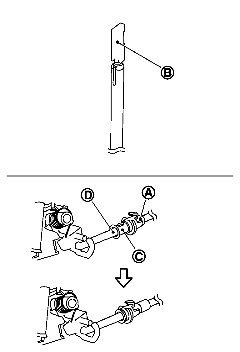 - 7.プルブロック(B)を下に押しながらキーインターロックケーブルのスライダー(A)をキーインターロックロッド(D)側にスライドさせて、アジャストホルダー(C)とキーインターロックロッド(D)を確実に取り付ける。