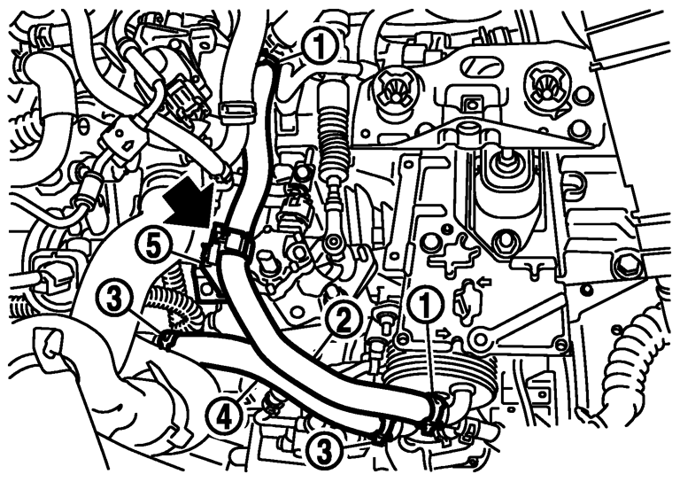 - 4.ホースクランプ(3)を外し、CVTウオーターホース B(4)を取り外す。