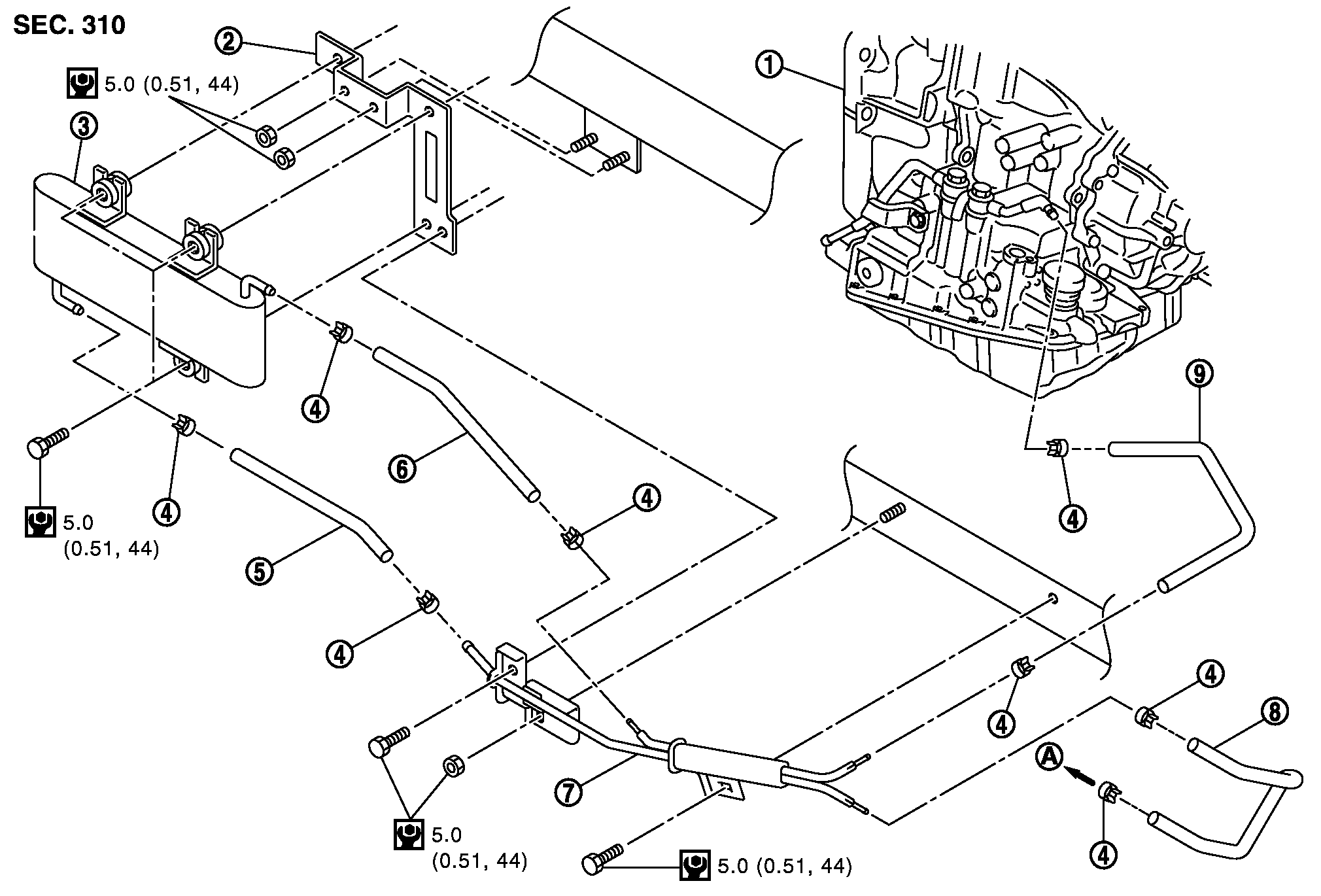 CVTフルード空冷クーラーを取り外す際、CVTフルード空冷クーラーを損傷させないこと。