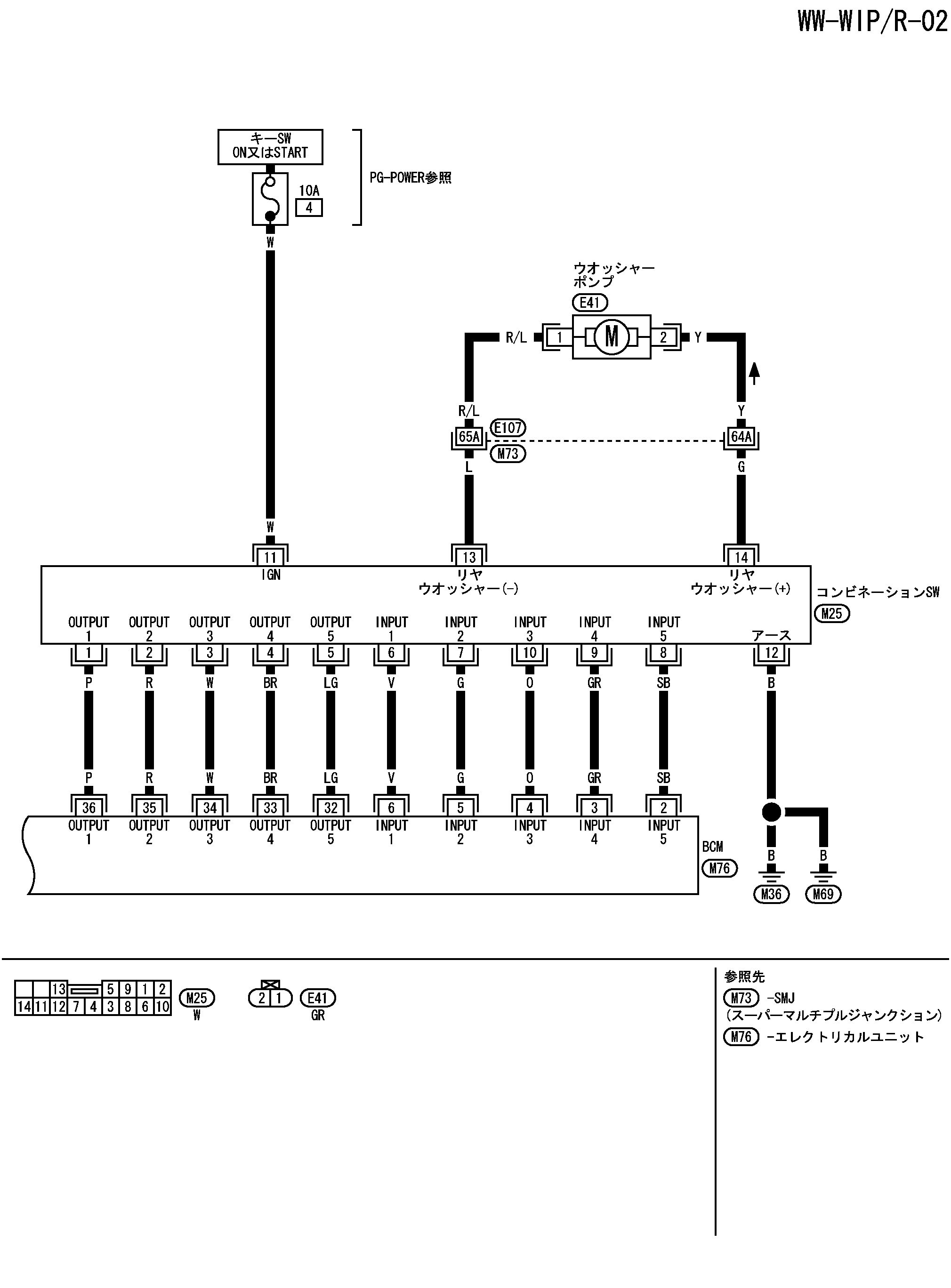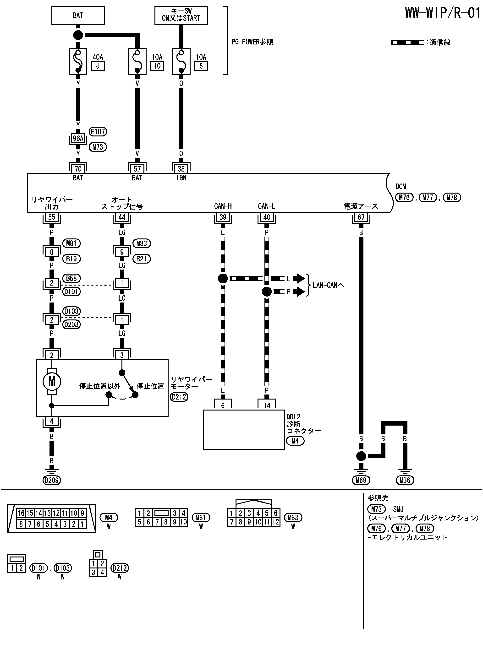- ワイパーボリュームの波形、及び電圧測定時以外は、ワイパーボリュームを4位置にすること。ワイパーボリュームの位置は、CONSULT‐IIIにて確認できる。CONSULT-IIIの機能(BCM - コンビスイッチ) を参照。