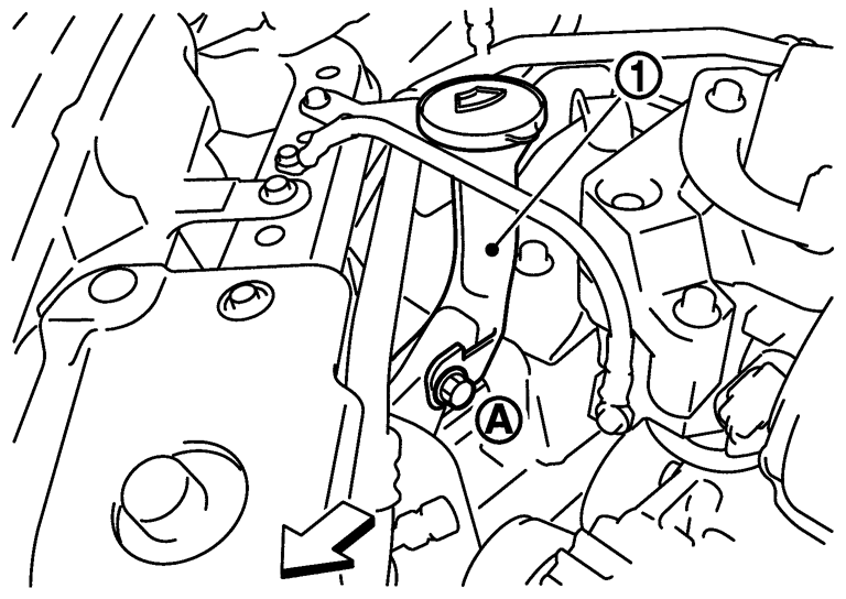 取り外し- 1.ウオッシャータンクインレット取付ボルト(A)を外し、ウオッシャータンクインレット(1)をウオッシャータンクより引き抜く。