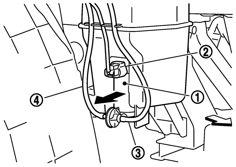 - 6.ウオッシャーチューブ(2)を外し、ウオッシャータンク(3)を車両より取り外す。