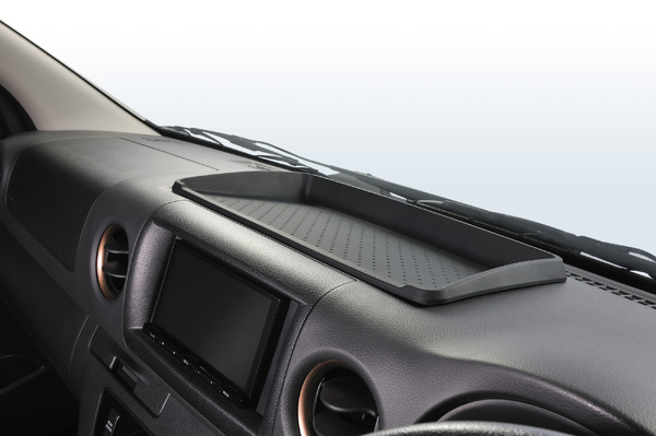 Далее — Center Console Tray, разработанный для ниши между подлокотниками в центре консоли. Внутренние габариты 200×160 мм идеальны для смартфона, кошелька, билетов или даже электронки. Силиконовая поверхность снова на страже: ничего не укатится под сиденье в повороте. Это эксклюзив для моделей с мультиконсолью, так что если ваш Caravan оснащён этой опцией, считайте, что удача на вашей стороне. Представьте: вместо того чтобы рыться в бардачке во время остановки на светофоре, всё под рукой. В фургоне, где пространство — на вес золота, такая мелочь превращает рутину в удовольствие. И да, с иронией: в эпоху беспилотников мы всё ещё боремся с хаосом в салоне.