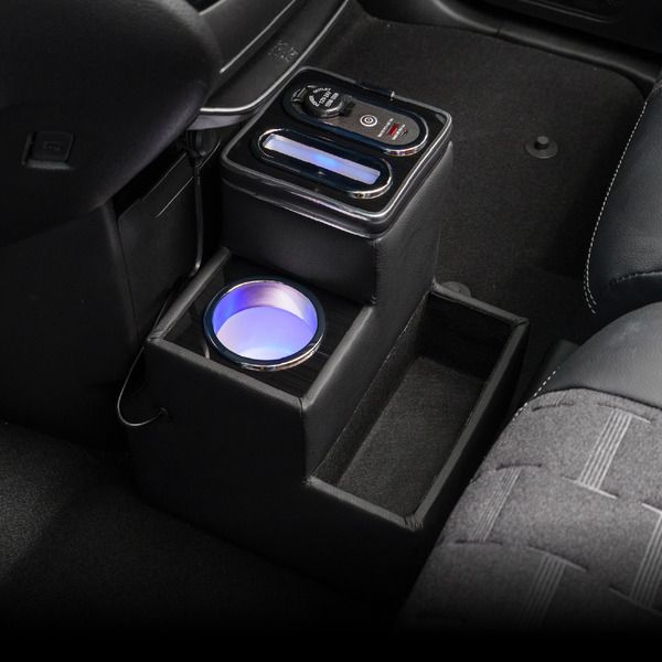 Верхняя часть — это уже территория wow-эффекта. Здесь и держатель для напитка, и вертикальный слот для смартфона с опцией беспроводной зарядки (в премиум-версии). Но настоящая звезда — встроенная LED-подсветка. Включите ее синим свечением одним нажатием, и салон мгновенно преображается: три уровня яркости позволяют настроить атмосферу под настроение, будь то романтический вечерний драйв или практичный поиск мелочей в темноте. А вокруг переключателя — USB-порты: Type-C с PD-поддержкой до 20 Вт и Type-A с QC до 22,5 Вт, плюс классический прикуриватель. И да, порты подсвечиваются, чтобы вы не ковырялись вслепую ночью — мелочь, а удовольствие.